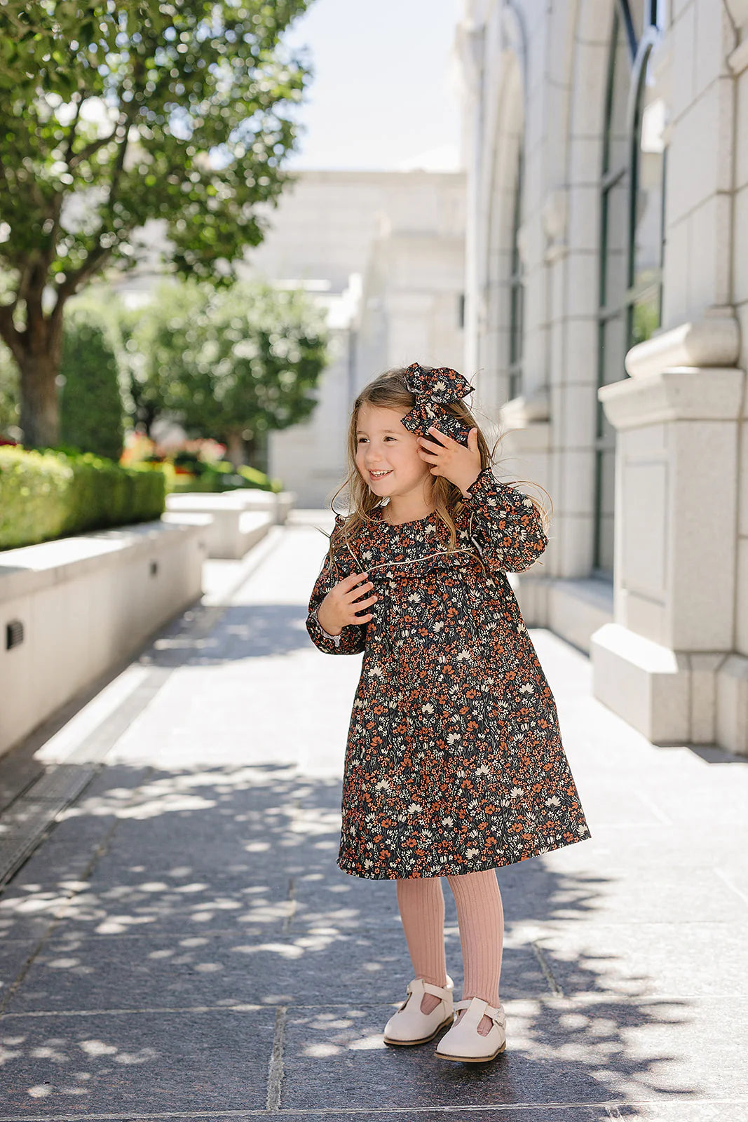 Our Midnight Meadow Dress is a sweet and comfortable choice for your little one’s wardrobe. Made from soft, breathable cotton, it features a lovely floral pattern and comes with matching bloomers through size 3T.