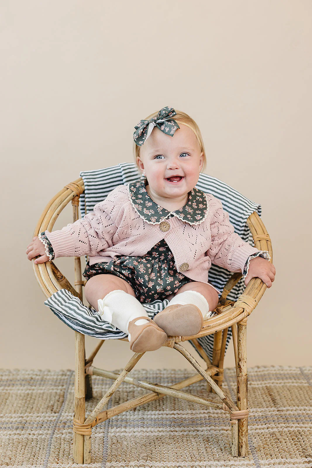 Our Olive Bloom Bubble Romper is a cozy essential for cooler days. Crafted from soft, breathable cotton in a beautiful olive hue. This bloomer features a beautiful Peter Pan collar with lace edging details. The bubble silhouette allows for easy movement and all-day comfort, while elastic at the legs and snap closures at the bottom make changes quick and fuss-free. Perfect for playdates, stroller strolls, or snuggly afternoons at home, this romper is both practical and picture-perfect.